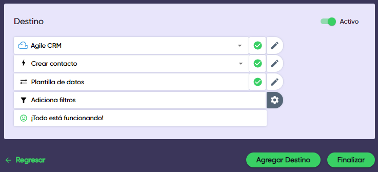 Selecciona Agile CRM como tu destino. Selecciona el Plug que deseas usar y haz clic en “Continuar”. Si no has creado uno, puedes hacerlo desde acá.
