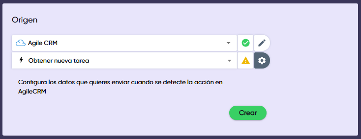 1. **Selecciona Agile CRM como origen** en la sección “Nuevo Gear” en “Gears”. Haz clic en “Crear”.