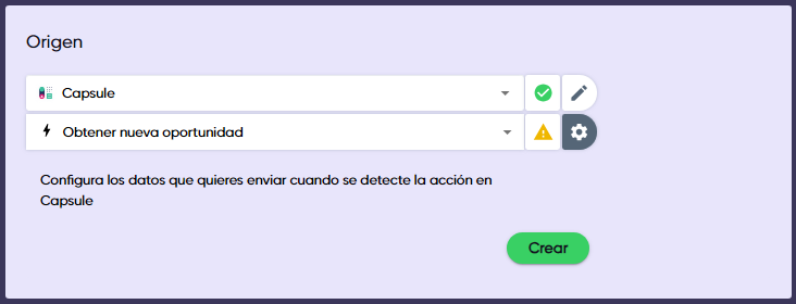 3. **Escoge “Obtener nueva oportunidad”** como tu acción y haz clic en “Crear”. GearPlug te pedirá un registro de prueba, así que crea uno en tu CRM.