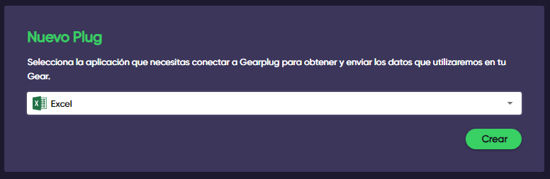 2. **Selecciona Excel** en el menú desplegable del bloque “Nuevo Plug” y haz clic en “Crear”.