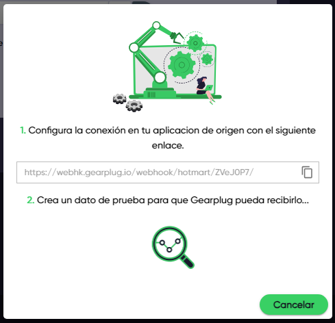 3. **Escoge “Obtener suscripción cancelada”** como tu acción y haz clic en “Crear”. GearPlug te mostrará la URL de tu webhook. Cópiala para el siguiente paso.
