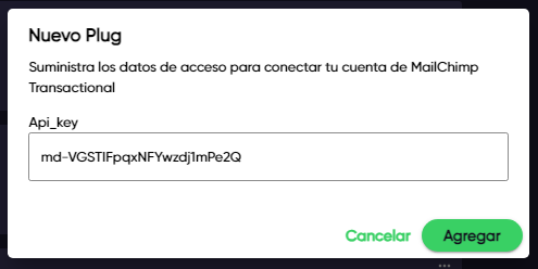 5. Introduce el código API en GearPlug. Para ello, solo debes copiar el serial generado en MailChimp transactional y pégalo en el campo "API KEY" de GearPlug. Después, haz clic en "Agregar".