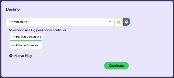 1. **Selecciona MailerLite como tu destino** y el Plug que quieres usar, o crea uno nuevo, y haz clic en “Continuar”.