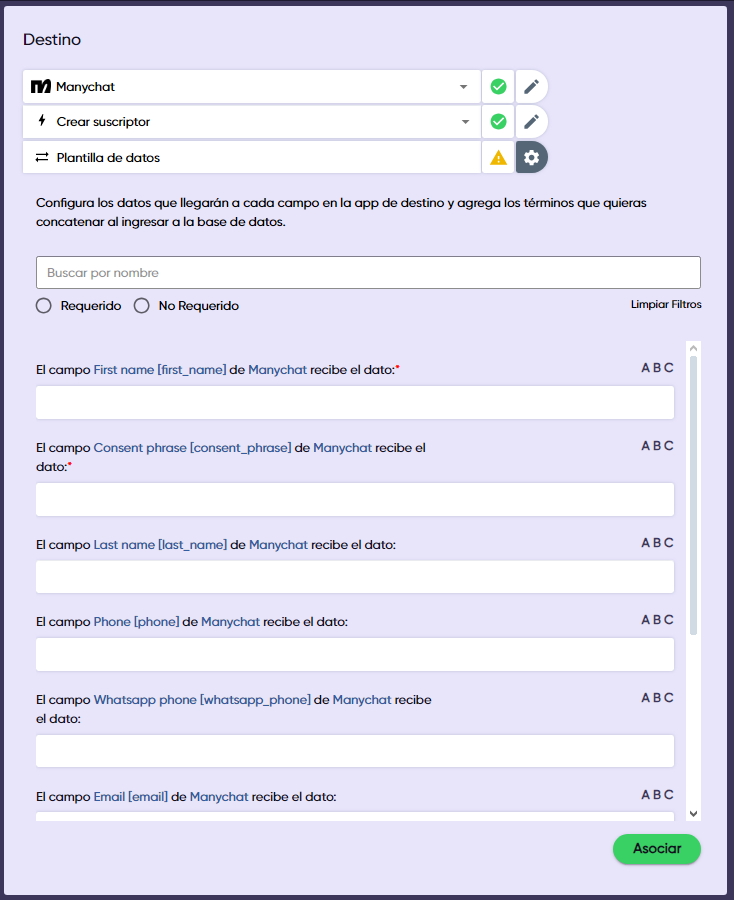 Llena la plantilla de datos, enlazando campos de origen y destino. Debes llenar los campos requeridos, pero puedes saltarte los opcionales. Haz clic en “Asociar” cuando termines.