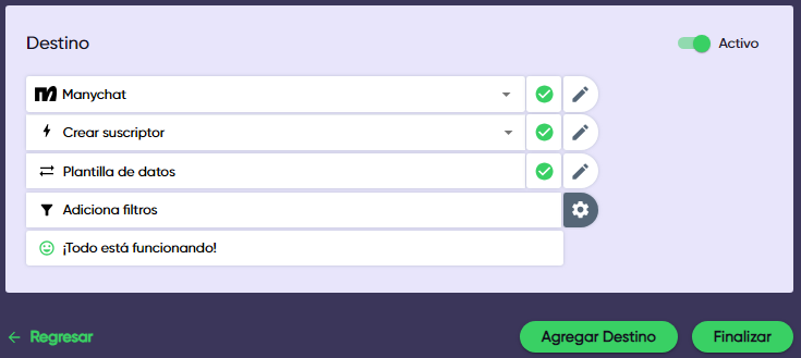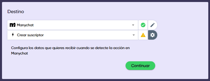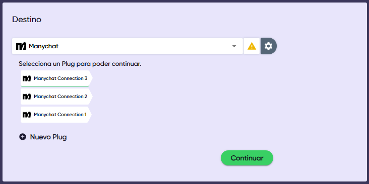Selecciona ManyChat como tu destino junto al Plug que deseas utilizar. Haz clic en “Continuar”.
