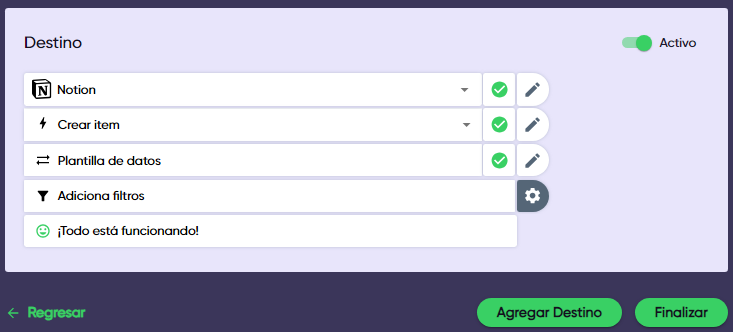 4. **Verifica que el destino esté activo** en la esquina superior derecha. Haz clic en “Agregar otro destino” para agregar más apps o “Finalizar” para guardar tu Gear.