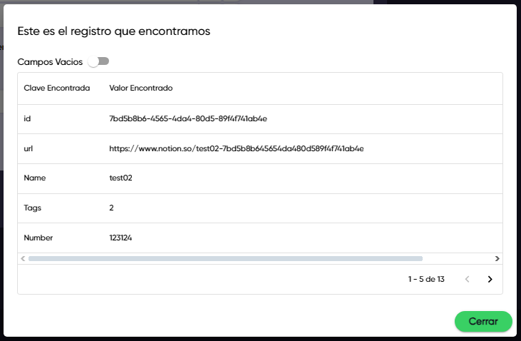 4. **Crea un registro de prueba** en la base de datos que escogiste. GearPlug importará estos datos, así que verifica que todo funcione correctamente. Haz clic en “Cerrar” para finalizar la configuración.