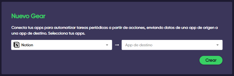 1. **Selecciona Notion como tu origen**, debajo de “Nuevo Gear” en el menú “Gears”. Haz clic en “Crear”.
