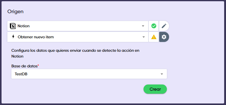 3. **Elige “Obtener nuevo ítem”** como tu acción y la base de datos que quieras usar. Haz clic en “Crear”.